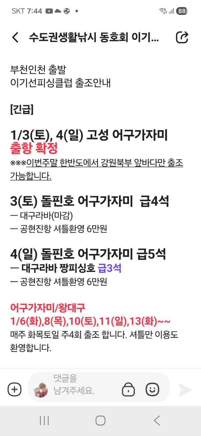 - ÀÏ ½Ã : 26³â 1¿ù 3ÀÏ(Åä) 2ÀÏ(±Ý) ¹ã 10½Ã30ºÐ Ãâ¹ß - Àå ¼Ò : ¿©¼ö ´º½ºÅ¸ÇÇ½Ì - ȸ ºñ : 24¸¸¿ø (ÇϳªÀºÇà 379-910327-30707 ÀÌÃá±Ù) - Áغñ¹° : Âüµ¼Å¸À̶ó¹Ù´ë(ÂÞ°©´ë°¡´É), ¼ÒÇü¸±&¼ÒÇüÀüµ¿¸±, ÇÕ»ç 1È£~1.2È£ ¼îÅ©¸®´õ 3.5~4È£, Çìµå 80~150g, °¢Á¾Å¸ÀÌ·ù, ¾ÆÀ̽º¹Ú½º30L µî - ¹® ÀÇ : 02-717-6119