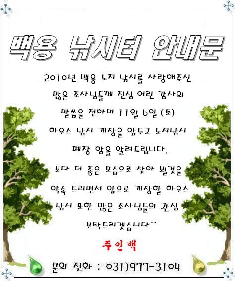 [¹é¿ë] ¡Ù ¹é¿ë ÇϿ콺 ³¬½Ã ÓÞ °³Àå ¾È³»¹® ¡Ù 10¿ù 29ÀÏ(Åä)..