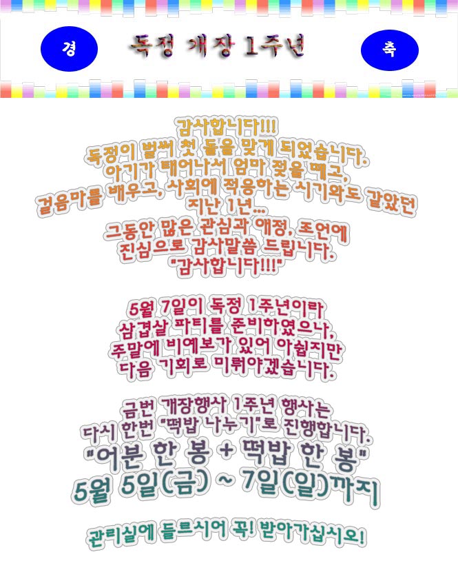 µ¶Á¤ °³Àå 1ÁÖ³â Çà»ç¸¦ ¸Â¾Æ ã¾ÆÁÖ½Ã°í °Ý·ÁÇØÁֽЏ¹Àº ºÐµé²²
